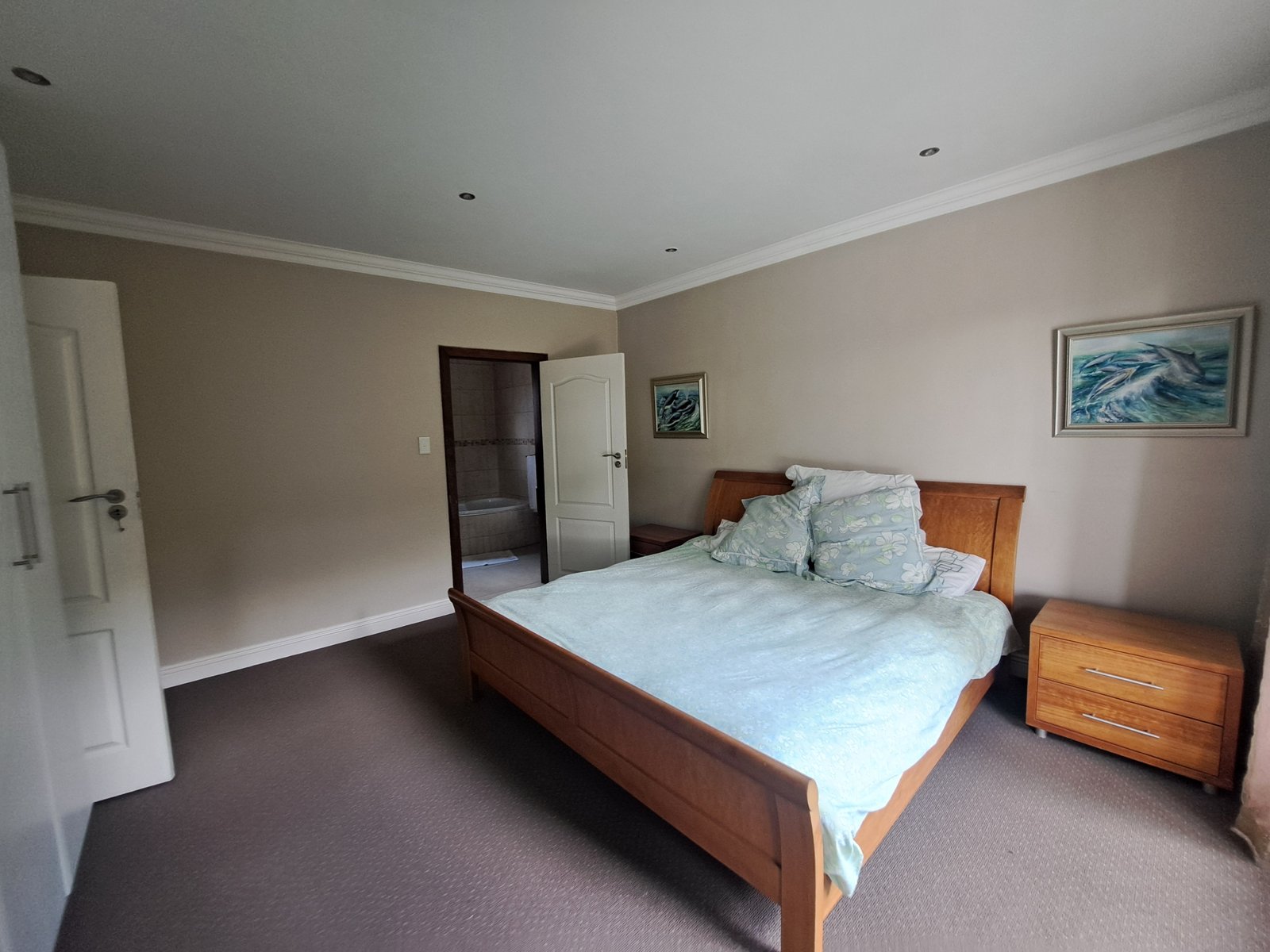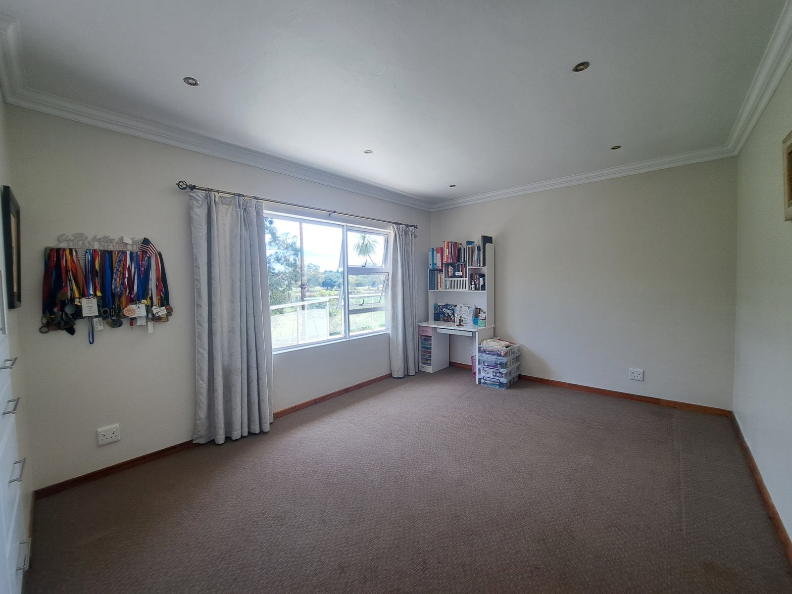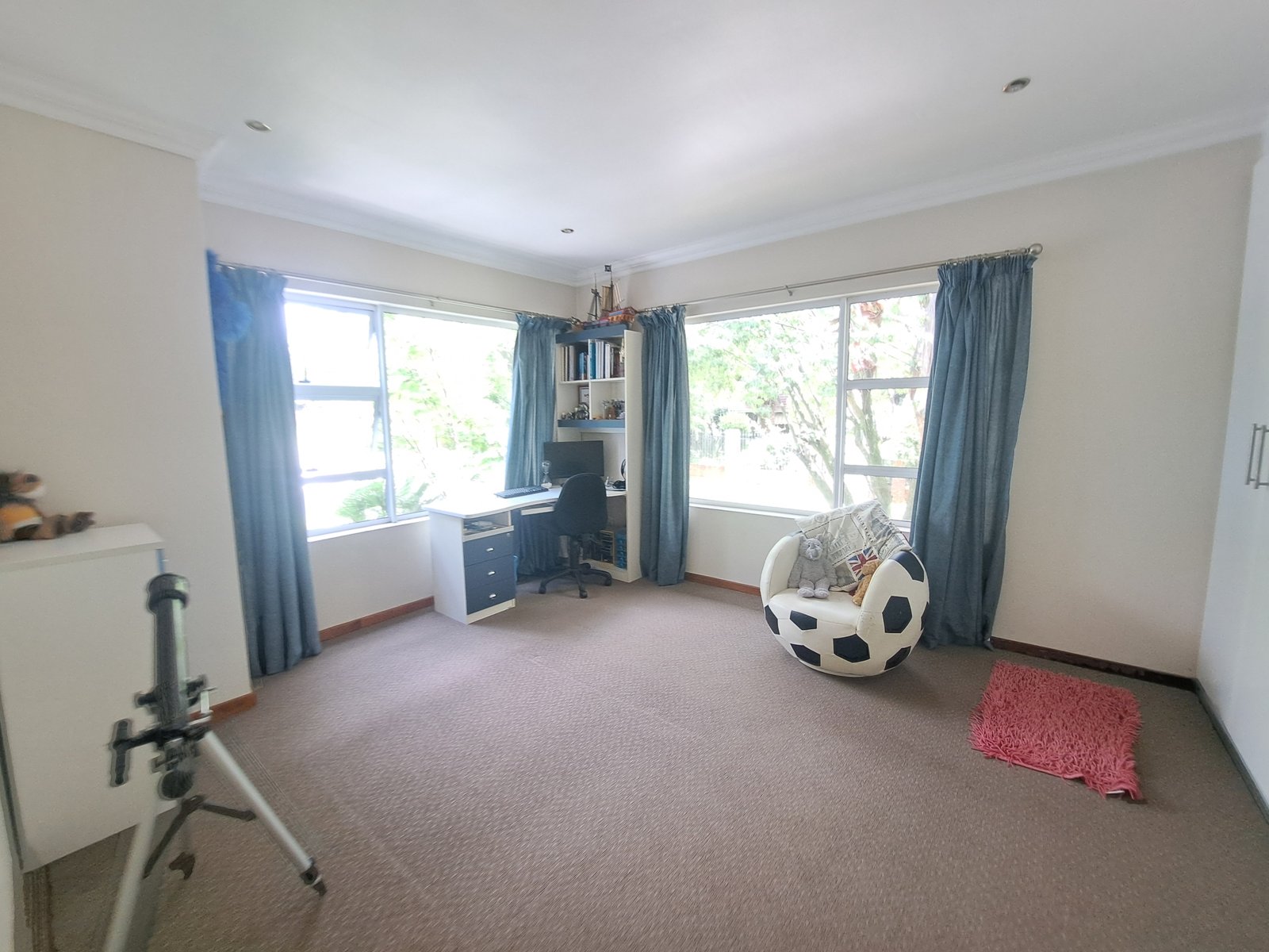 Accommodation includes a study with built-in cupboards, five carpeted bedrooms, four bathrooms, and a guest toilet.